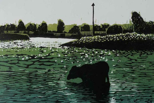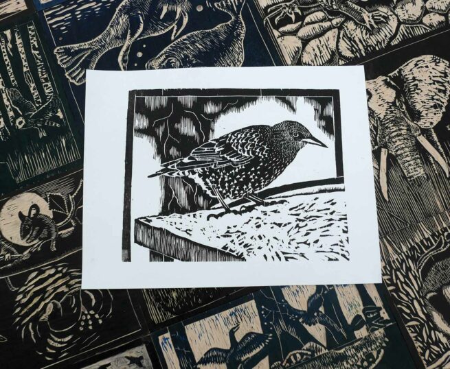 Houtsnede, een tekening omzetten in lijnwerk (puur zwart of wit) en wat haal je weg, wat laat je staan. Er is eigenlijk geen weg terug als je gesneden hebt. En helemaal interessant als je met verschillende drukvormen over elkaar gaat werken zoals bij de gans of de boom in Limburg-Bruisterbosch.
